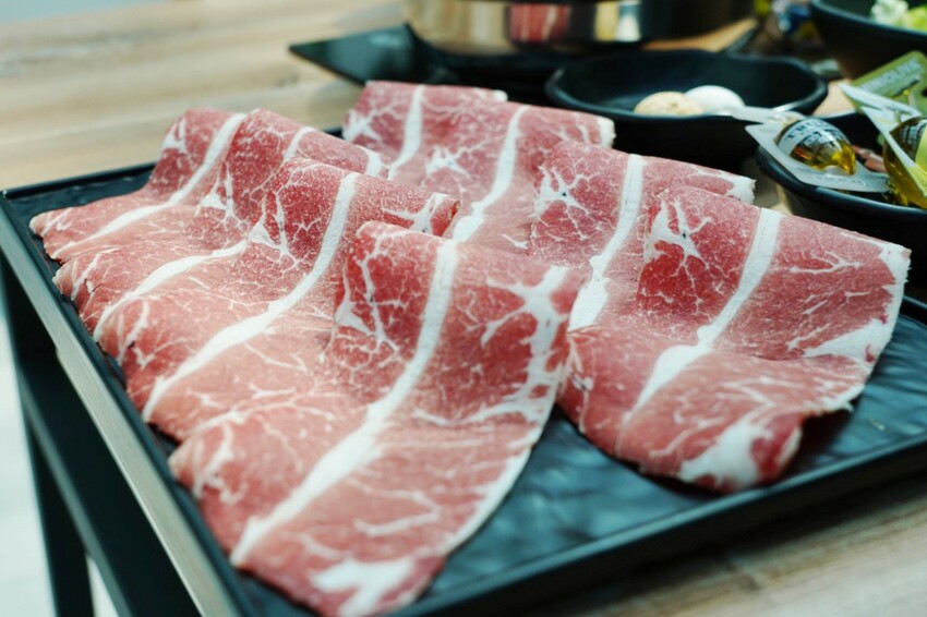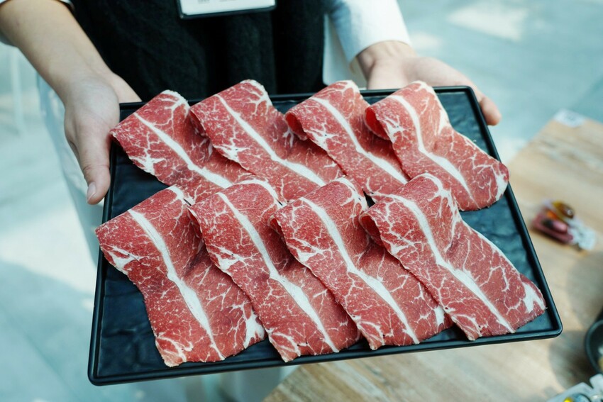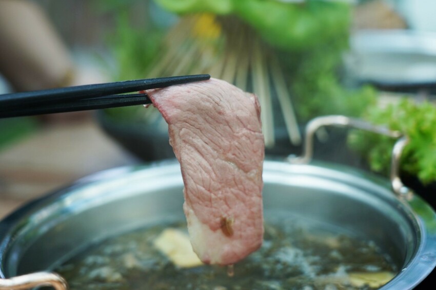 天然放養美國牛,不使用任何生長激素,板腱位於肩胛骨上方,簡單涮到淡嫩色即可,原味肉質軟中帶點緊實感,吃到後面還有一絲嚼勁。