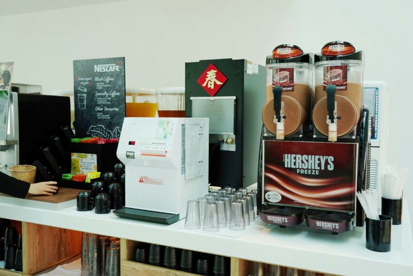 自助區近20種飲品咖啡,有各種咖啡、果汁、蔬果汁與茶包..等,還有我愛的Hershey’s巧克力冰沙。