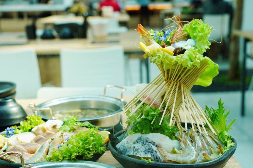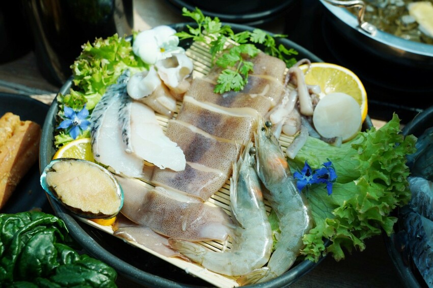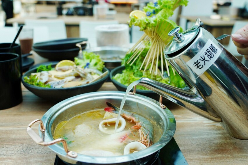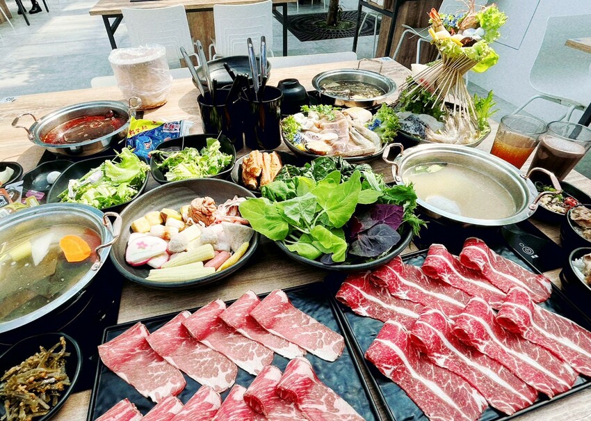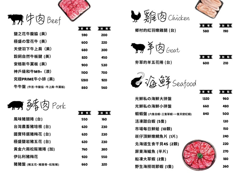 鍋物有牛、豬、雞、羊與海鮮可選,基本消費是一份套餐,吃不夠後方有加點價格,最便宜一份套餐550元起、最高的海鮮1320元。