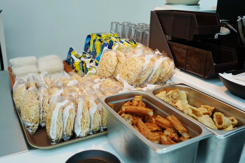 還有意麵、冬粉和科學麵,一旁還有吃麻辣湯必加老油條、豆皮。