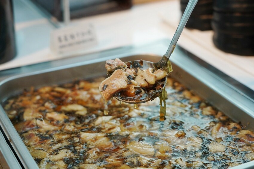在地阿婆做的客家福菜,經過曬乾、搓揉捲起與醃漬,要等上數月才能煮,客家福菜加昆布湯一起煮,福菜湯好入味有阿嬤味道,酸香氣帶點昆布甘甜味,真的是純天然風味。