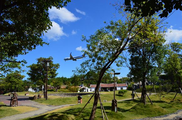 因為松山機場就在不遠處,所以在園區時常可看到飛機從天空飛過的景象,