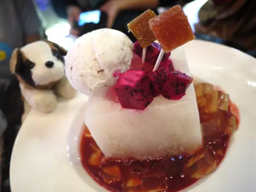 配料方面,好像是任選四種,因為我們是吃飽才來,所以實在吃不太下推薦的鳳梨酥,所以我選了小一點的乳酪蛋糕二個,另二種是雪球~我以為也是冰,結果不是哦~