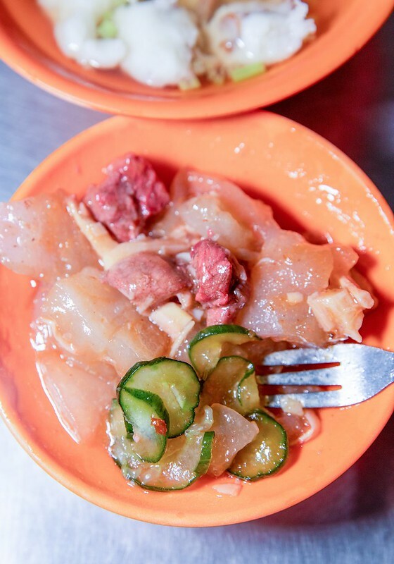 內餡方面以紅糟肉和筍絲為主,少有其他的食材在裡面,這攤的紅糟肉基本上是我喜歡的,筍絲對我來說略不入味,還能嚐到一點筍絲的生味,但猜想應該也是有人愛這樣的筍絲。黃瓜片是我最愛的肉圓配料,即便我是香菜控,但肉圓就是要配黃瓜....這攤的黃瓜片就是基隆肉圓的味道,爽脆。