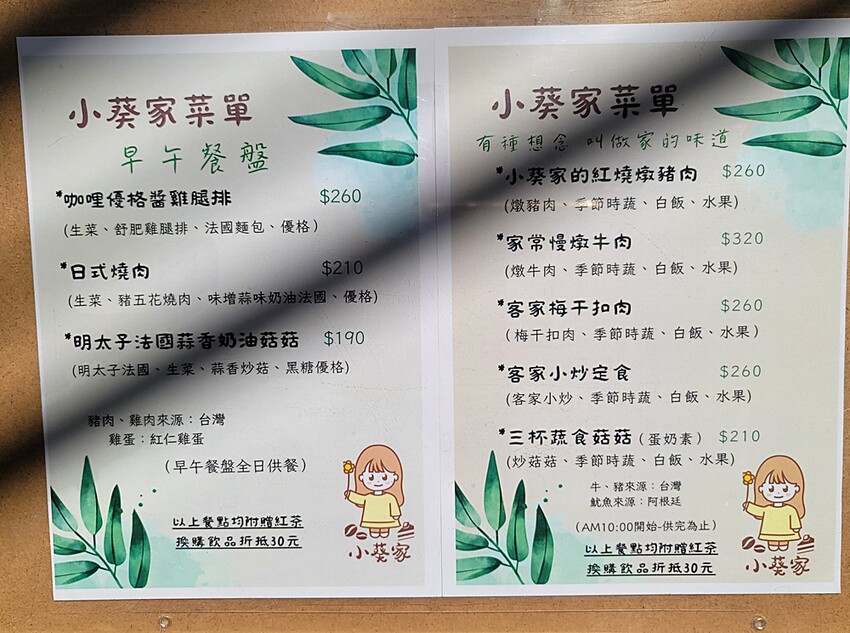 小葵家菜單,除了早午餐盤、家常料理、還有手作甜點、飲料等…. 都是全天候供應唷!! 這邊有低消一個主餐或早午餐盤或飲品。支付方式:現金、line pay