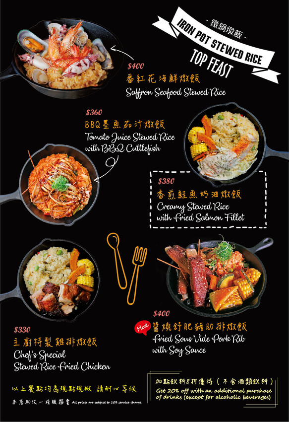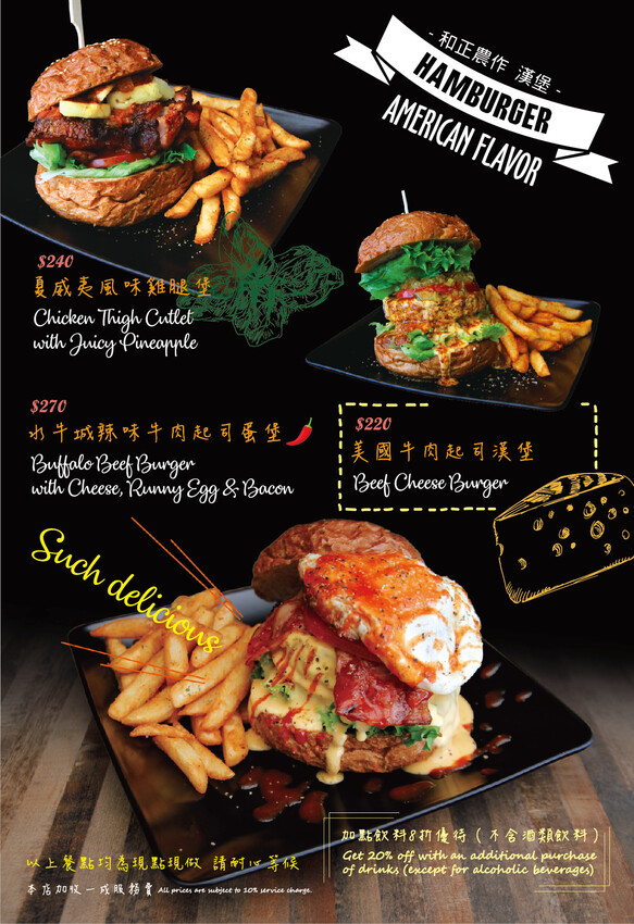 除此之外也有提供美式三明治、義大利麵、開胃炸物、鐵鍋燉飯等餐點