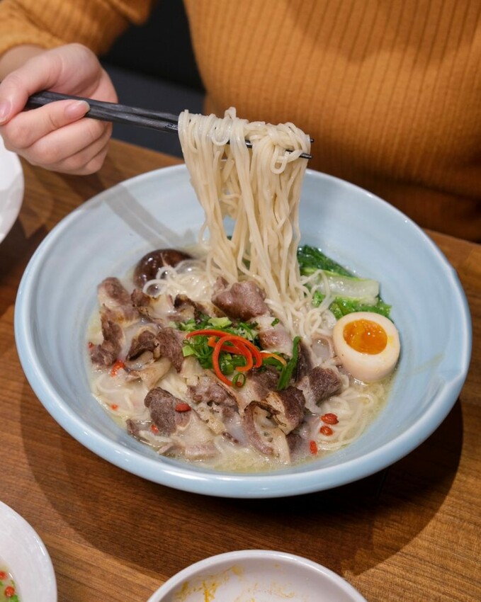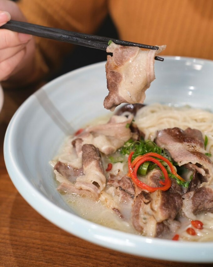 ▼炙燒牛五花熱湯麵以雞白湯作為基地,喝起來甘美鮮甜,還有枸杞和蔥花的香氣,搭配炙燒後的牛五花肉,多了油脂的甘甜味,也讓湯頭的風味更上一層樓,整碗喝起來濃郁到不行~
