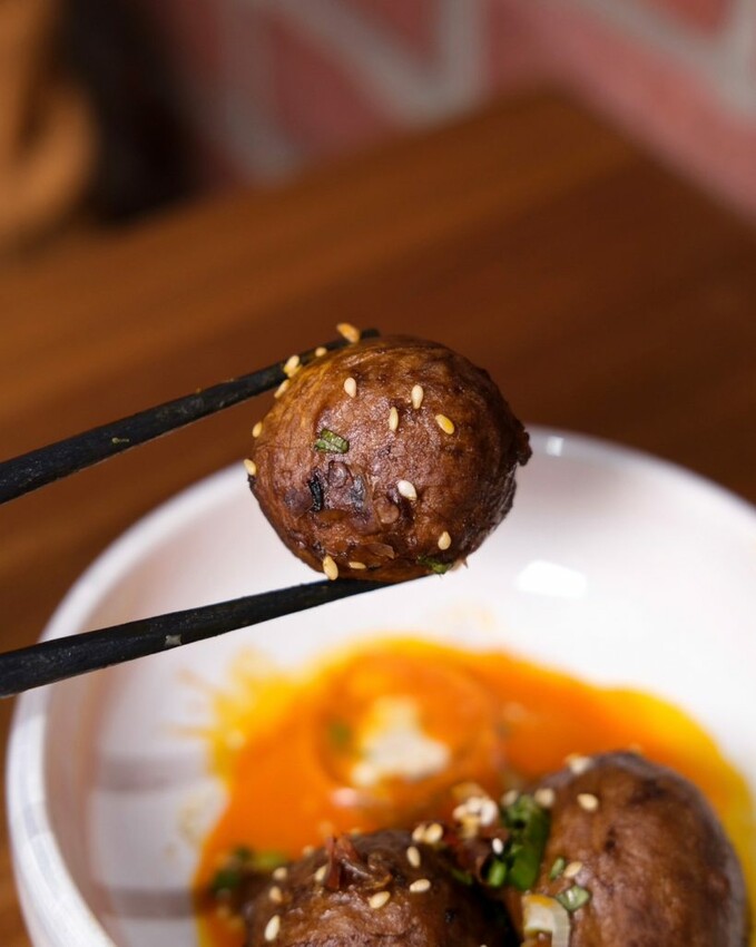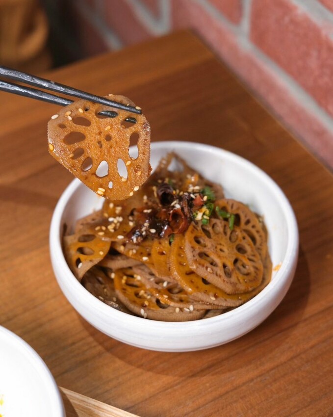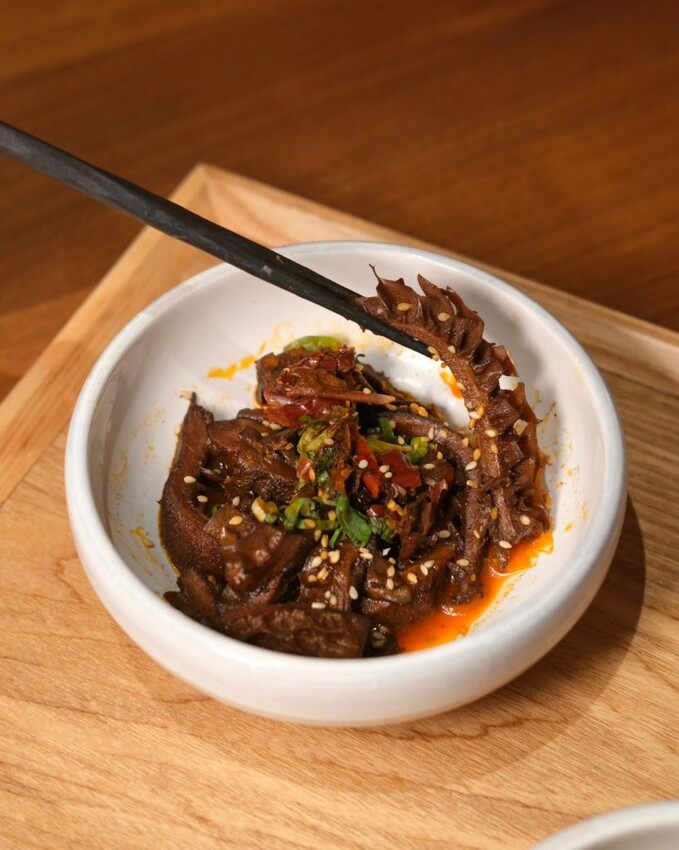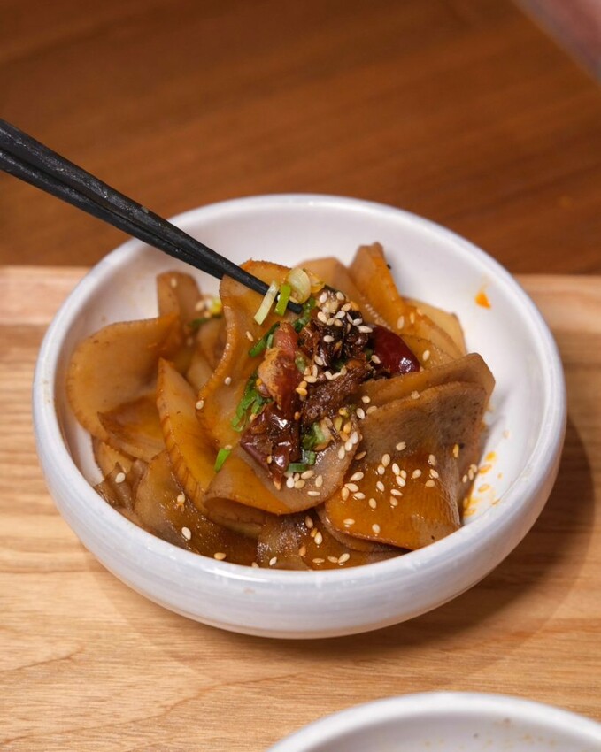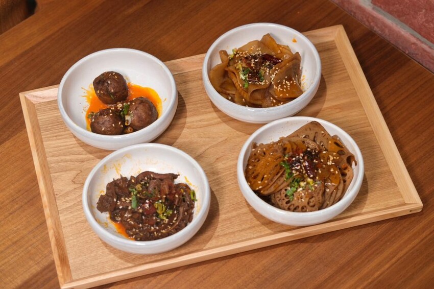 ▼牛油辣鍋小菜也是不可錯過,將食材放入辣牛油中慢火滷製,光看色澤就能知道超夠味,土豆片和蓮藕片爽脆帶勁, 麻辣牛肚嚼勁又充滿彈性;潮吹牛筋丸口感紮實且彈牙,咬下去還會爆汁,香辣調味會讓人越吃越涮嘴!