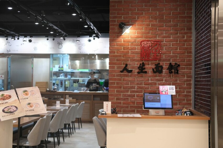 ▼【人生麵館】有規劃獨立的用餐區域,紅磚牆面搭配木質調裝潢,格外充滿溫馨和舒服的氛圍。