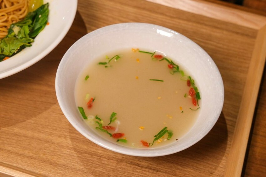 ▼人生麻辣麵會附上小菜和一碗雞白湯,只要百元的價格CP值超高,選用嚼勁感十足的日本拉麵麵體,淋上多種辣椒、花椒及牛油熬煮的麻辣醬汁,吃的時候要先攪拌均勻,讓每一條麵都吸附著麻辣醬汁,更加入味又好吃,香麻中帶點酸辣味,整體辣度味道充滿層次感。