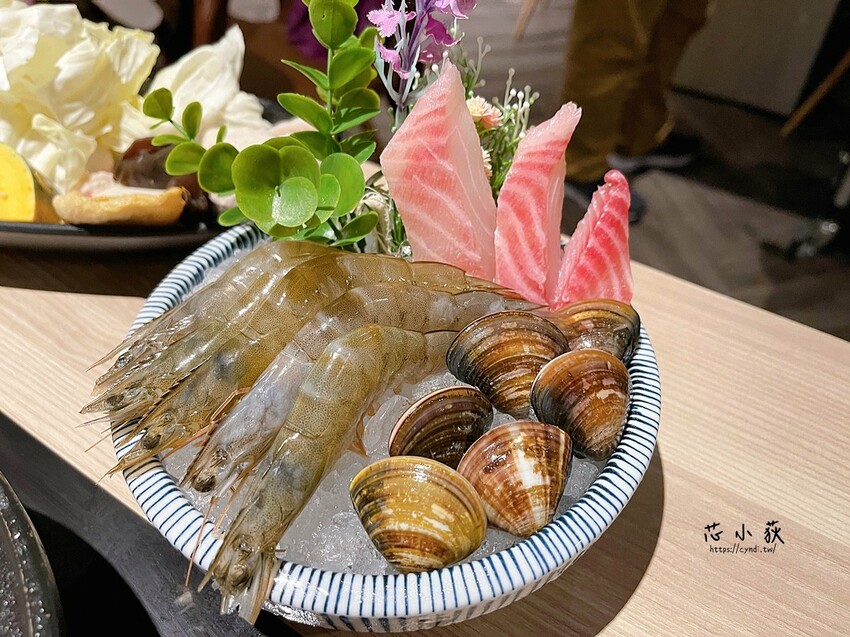 生炒花枝鍋小荻選擇搭配海上花,有蛤蜊、鯛魚、小白蝦(依季節更替),搭上生炒花枝鍋的清甜爽口湯頭非常搭。
