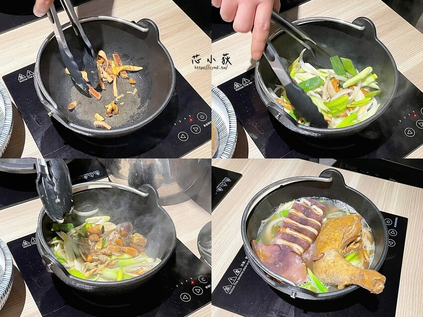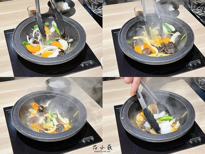 狂一鍋的鍋物講究爆炒的鑊氣,所以大部份的鍋物都是在桌邊現點現炒,將魷魚干、蝦米、香菇爆香後,再加入洋蔥、蔥段翻炒,蛤蠣、螺肉以及蒜頭一起拌入,加入高湯,最後擺上霸氣的大雞腿以及大魷魚就完成了霸氣魷魚螺肉蒜,在現炒的過程中香味隨之撲鼻而來,讓人食指大動。