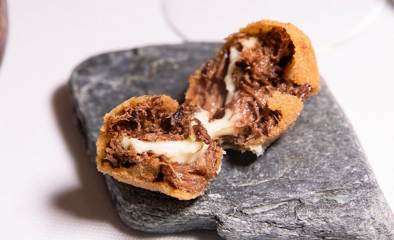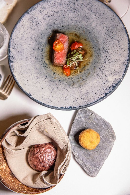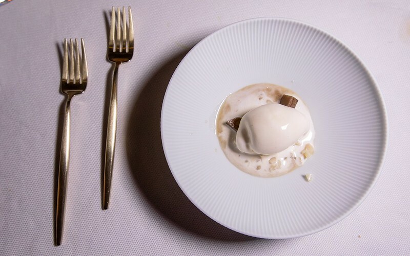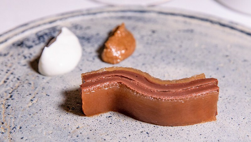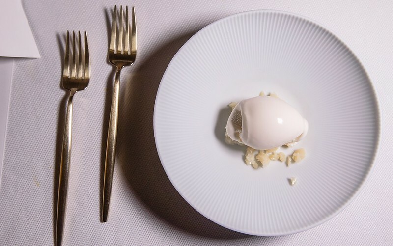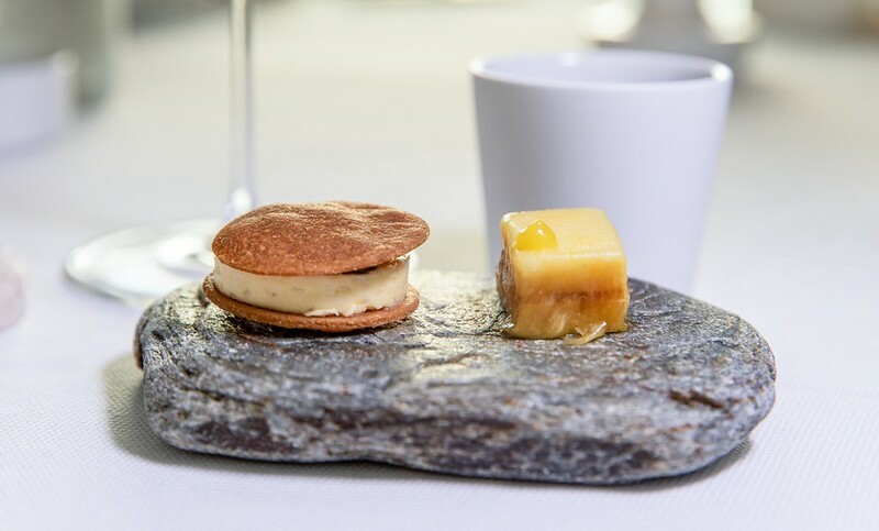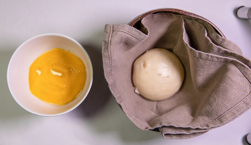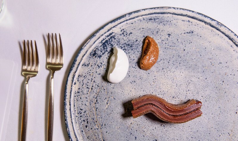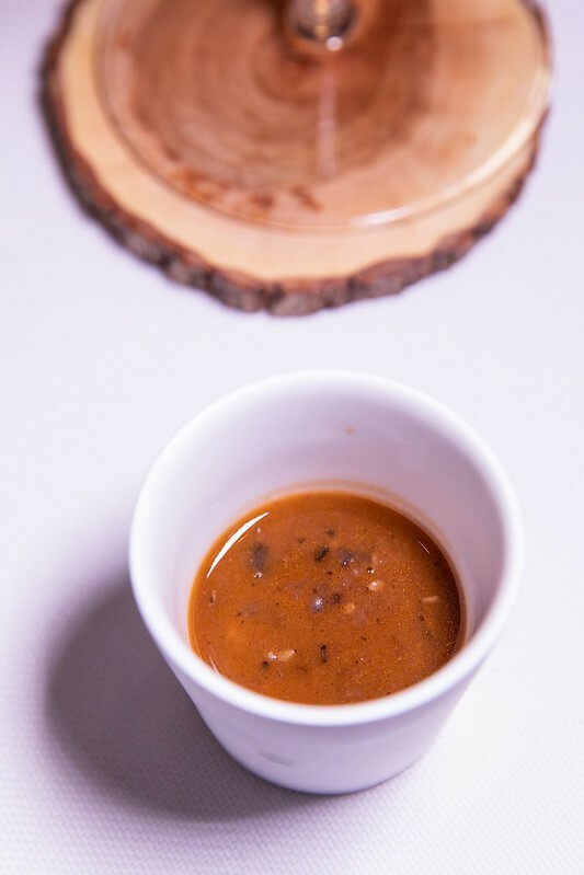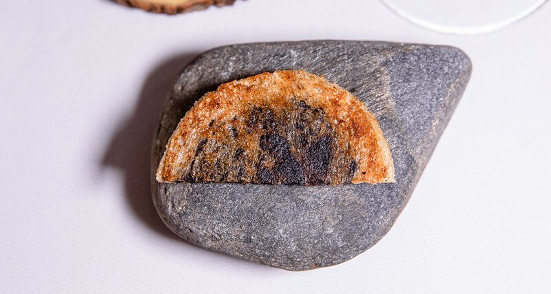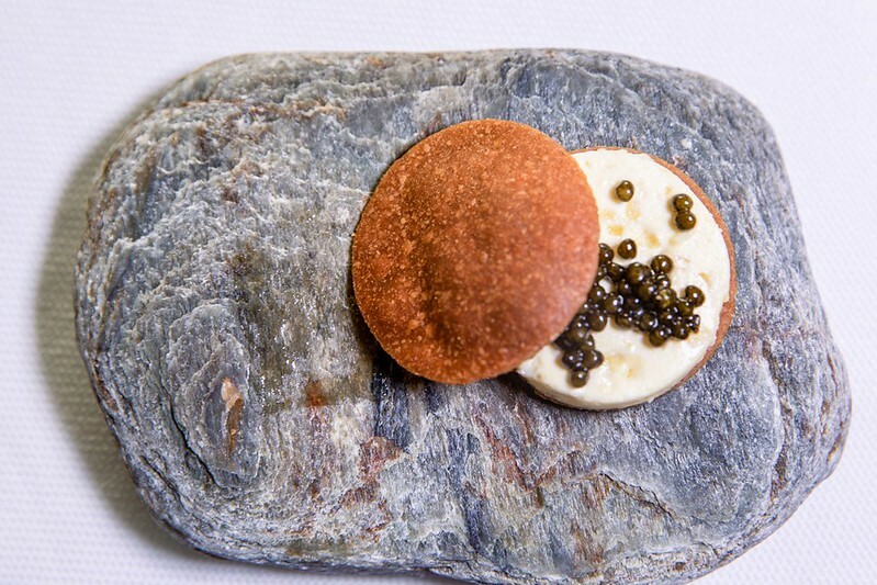 打開這個像銅羅燒的古琉球模樣的麵包,裡面放著像是魚子醬,我又翻了一次menu上面寫著也確然是「truffle」,但咬了一口發現真的是松露,於是猜測是用松露利用分子料理的手法,轉變成魚子醬的外觀(又或是兩者兼有之),像是主廚跟客人間的一個小玩笑、小遊戲。但不管是魚子醬還是松露,那主角奶油和麵包卻是無與倫比的美味,像是吃了三明治、也像吃了奶油夾心餅般的愉悅。