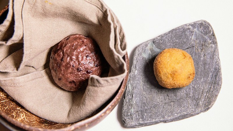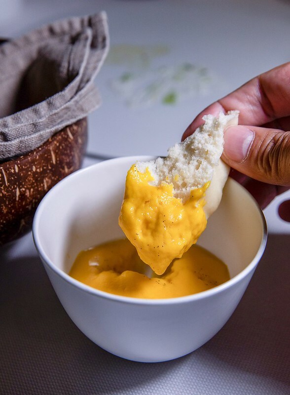 附上的麵包是以沖繩古法製作的,也許賣相不討好,但口感極好,有一點像台灣的發糕,多了一點嗣嚼般的黏糯,後端的綿甜卻也半點不輸現今的麵包,沾上一點甜得不像話的南瓜泥,也是一種另類法料餐前麵包的美好。