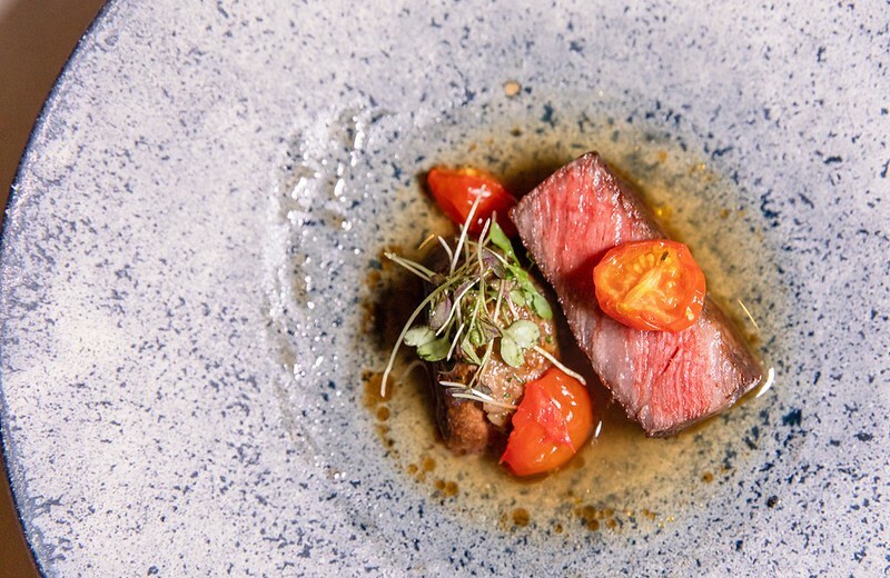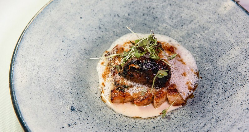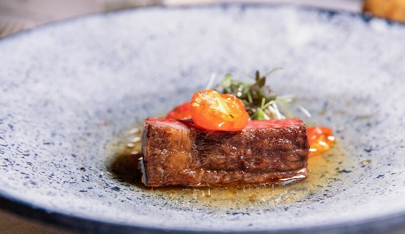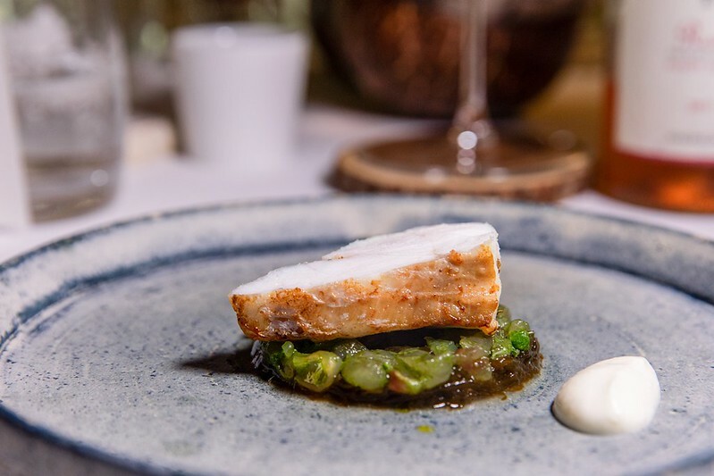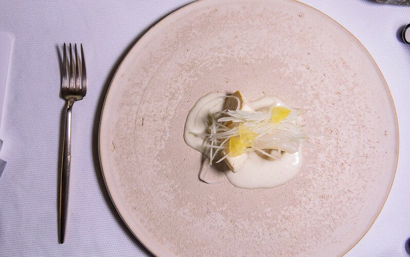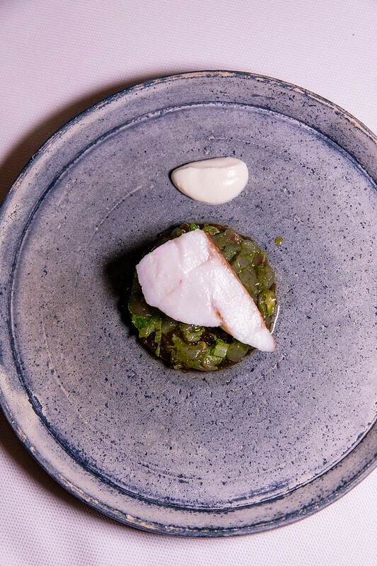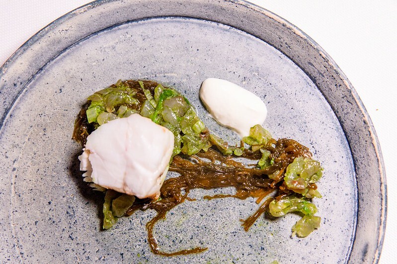 說是石班魚的一種,但吃起來又特別的軟嫩,幾乎沒有油質的魚肉,咀嚼端散滿著滿滿魚鮮,底下是沖繩的野菜、海藻舖陳的海洋舞台,多少加強了一點海的鹹味和沖繩料理的野性,搭配有著酸奶微清新的鮮奶油,便是法式日餐醬汁的精髓,簡單又不失味覺上的華麗。