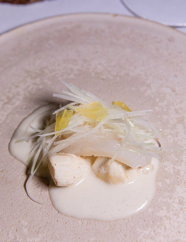 這道海鮮前菜的主食是「烏賊」,用得是沖繩系滿,捕貨量日本第一的袖烏賊。袖烏賊算是體形比較大的烏賊,正常來說也都有一米,據說在沖繩曾捕到20公斤重的巨型袖烏賊,沖繩的袖烏賊盛產期正是我們到訪的1-2月,也是SHIROUX之所以選用的主因,以高湯川燙後的袖烏賊(熟成手法),微脆又多了一點黏纏綿細的口感和甜度,再佐以日式法餐的手法配上輕柔又不搶味的醬汁,加上杏鮑菇相佐,裝飾上用了一點沖繩的柑橘、檸檬添了份視味覺的清爽。