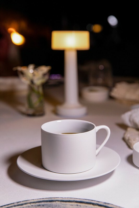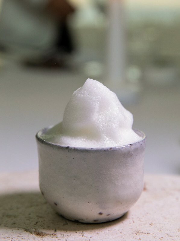 開場是像是沖繩陶藝茶杯裝盛的泡泡,說法是以沖繩招待貴賓的茶,融入一點法式、一點日式,甚至是一點中式的茶泡手法製作而成,那茶泡細緻的像十倍化的綿花粒,在消挺的一瞬間多了一點澎松口感,剩下的就是微微茶苦的清香,開場就很特別。