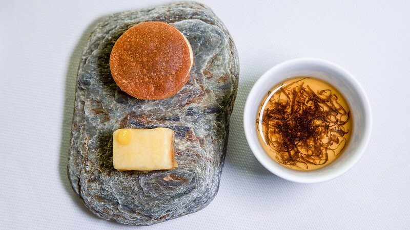 第一道前菜menu上寫著鳳梨、海蛇、松露、奶油三明治,餐盤同樣像是沙灘上岩石,彷彿能聽到海浪聲般的輕柔。海蛇聽著很可怕,卻是沖繩常見的料理食材,你要是願意可以在沖繩的居酒屋點上一碗海蛇湯、甚至是海蛇麵,據說是沖繩古琉球傳下來的料理,你在國際通上也可以看到很多用泡盛泡製的「海蛇酒」,另一種則是波布蛇酒。SHIROUX的第一道前菜就告訴你,這是一場沖繩料理的法式冒險....實際上聽著可怕,但吃起來一點也不可怕,要不說你完全不會覺得可怕,嚐來有一點像日式的高湯的清徹,有有一點法式清澄湯的喉韻,喝過這杯興許可以讓你下次敢於挑戰沖繩的海蛇麵、海蛇湯,甚至是海蛇酒(笑)。