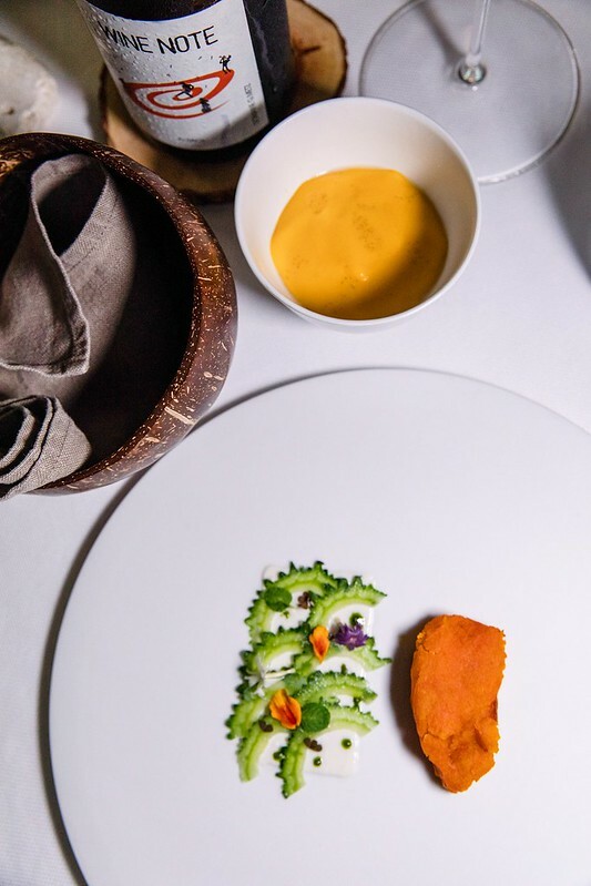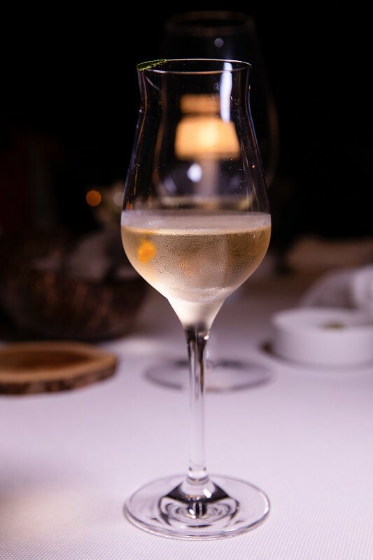 香檳之後接的是WINE NOTE ORANGE 2020的橙酒,也是餐廳常見的餐前酒,又或者說把香檳當迎賓酒,橙酒才是真正第一隻的餐前酒。略懂酒的就知道,橙酒其實和「橙」這個水果無關,那琥珀金黃的成色是長時間浸泡葡萄皮而來,風味上卻會帶點像是橙橘的甜味,這點在這隻酒上特別明顯,佐餐單飲都有不錯的風味。