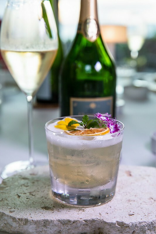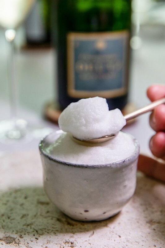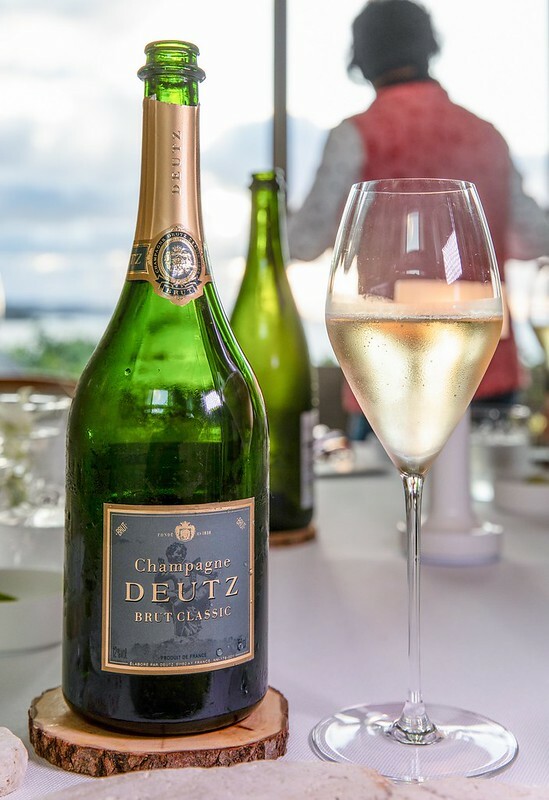 五杯的佐酒第一杯是法國帝資酒莊(Deutz)的經典冠軍香檳酒,這酒在台灣應該也不難買到,入口是蘋果香般的輕盈,以韻是微微柑橘的輕酸,非常適合當作開胃的前酒。