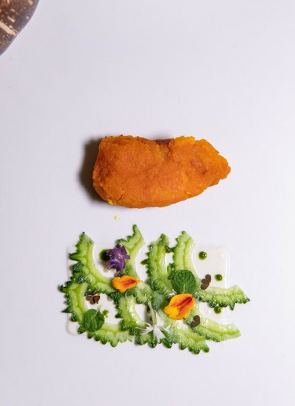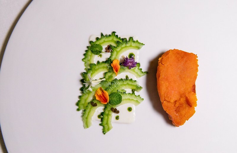 第一道料理是隨著茶泡而上,都是menu上沒有的迎賓前菜。這道使用的是微漬過的苦瓜當擺飾,同行的沖繩友人笑著說,從沒看到這麼美的苦瓜,原來沖繩的苦瓜也可以這麼法式。右手邊是沖繩的かぼっコリー(沙律南瓜),入口時我很懷疑,因為那實在是超過我對於南瓜的理解...想當然這是經過廚師的巧手,還原簡單的南瓜風味,就像苦瓜之於沖繩人,那麼平凡、那般自然,就讓人嘴角不住上揚,打從心底輕呼了聲:「好好吃」。這前菜,好像也承襲了川手寬康在menu上寫的「自然」,還有他眼中的沖繩料理,並把簡單的東西作到不簡單。