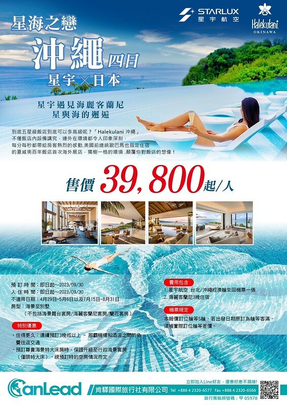 肯驛推出的39800元起的星海之旅優惠套裝行程,即日起到9月底前有效,並贈送價值1.52萬元的沖繩機場返往接送服務,4/29-5/6日本黃金假期與7/15-8/31日本盂蘭盆節與暑假檔期價格另議,另星宇航空S艙等客滿時,搭乘其他艙等需須差價。