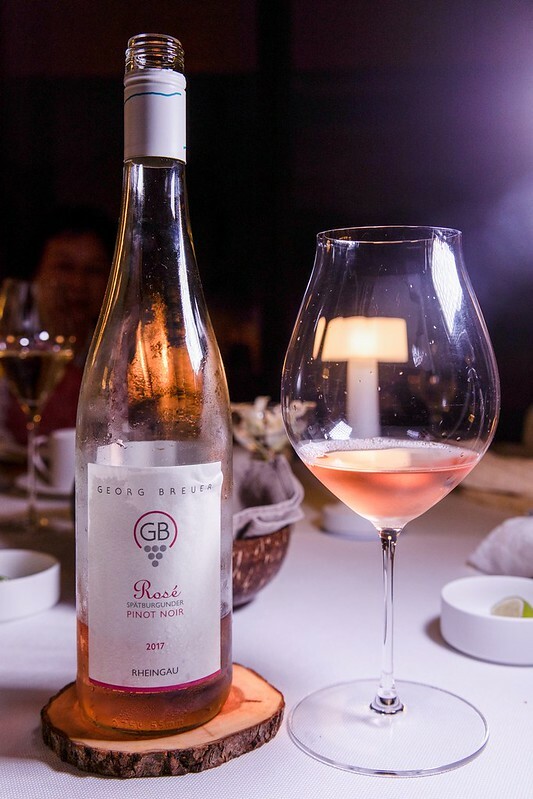 第四杯是德國的2017 Georg Breuer GB Spatburgunder - Pinot Noir Rose,相對酒體亮麗的葡萄酒,有著粉紅香檳的討喜顏色和喉韻,酒氣不那麼高的口感及味覺,很適合作為宴會主酒,搭配海鮮、肉類,主、副食,甚至是甜點都遊刃有餘,個人非常喜歡的一隻酒。