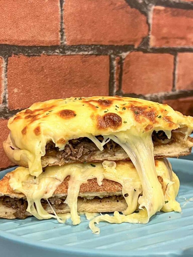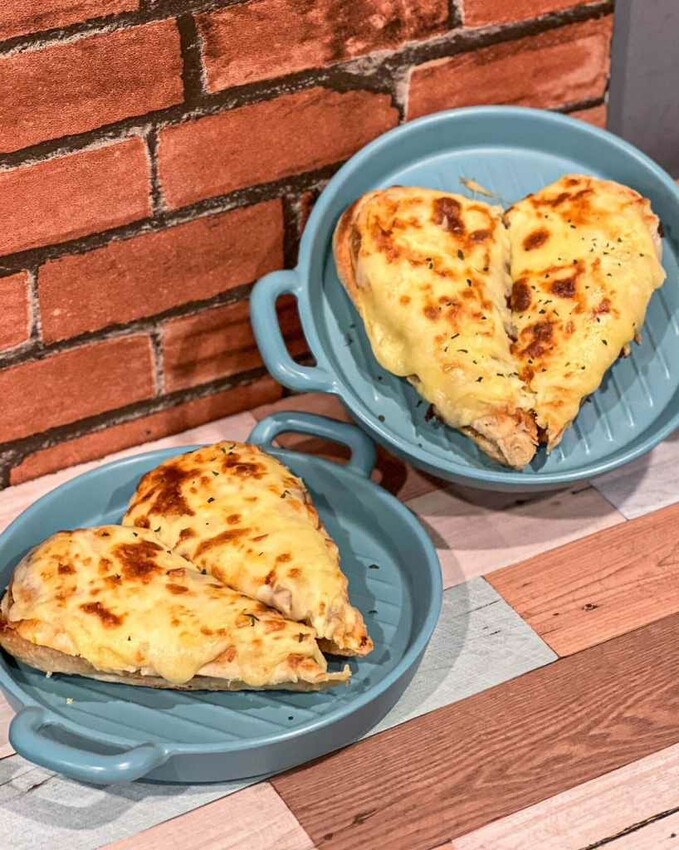▼加上餡料與起司進行焗烤,切半後竟然會變成愛心形狀😍好吃好拍又吸睛!起司牽絲超過20公分,可見老闆用料不手軟欸。