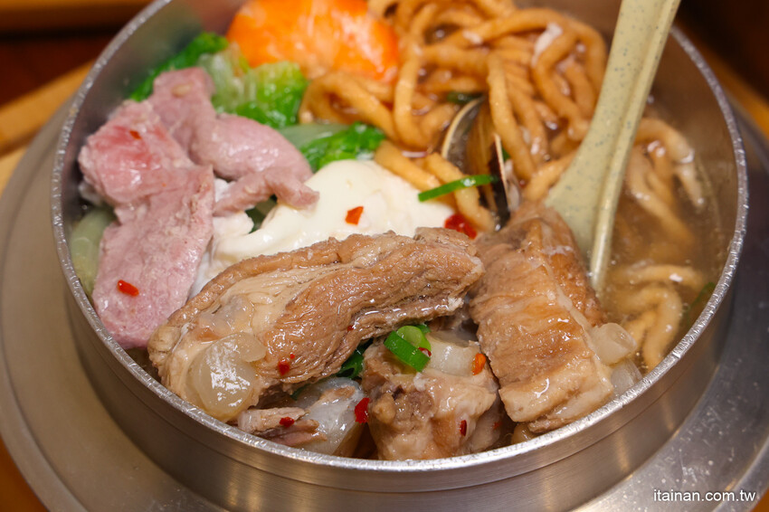 一碗鍋燒意麵裡面的料也不少,除了主角嫩骨外,還有蛤蜊、豬肉片、白蝦、半熟蛋、小白菜,是單純的古早味台南鍋燒意麵的標準配料,吃來清清爽爽不油膩,但配料也能吃得很滿足有創意。