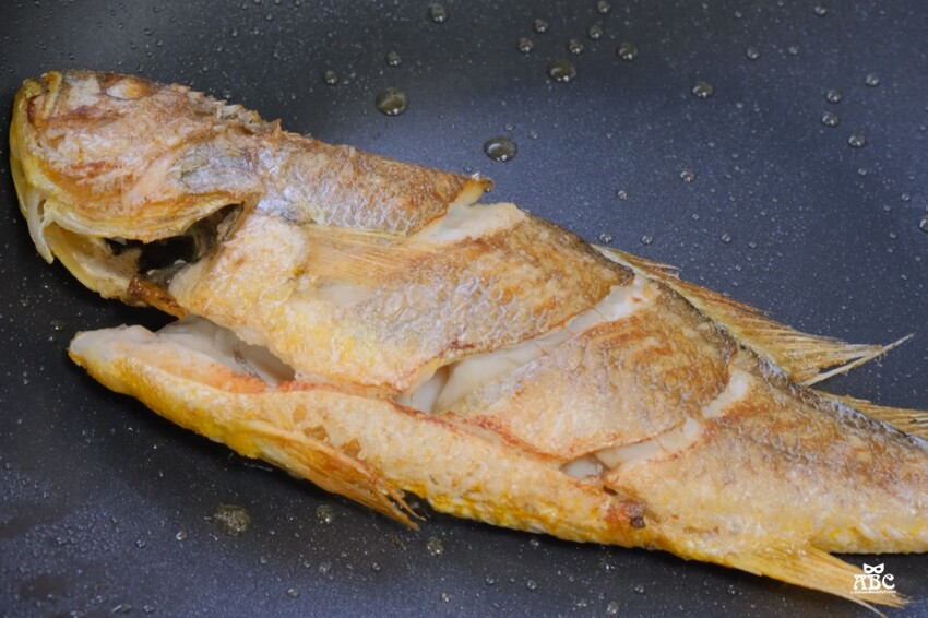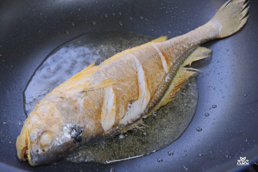 4. 開蓋翻面煎,等兩面都煎到金黃色,就把多餘的油先倒掉,魚留在鍋中。