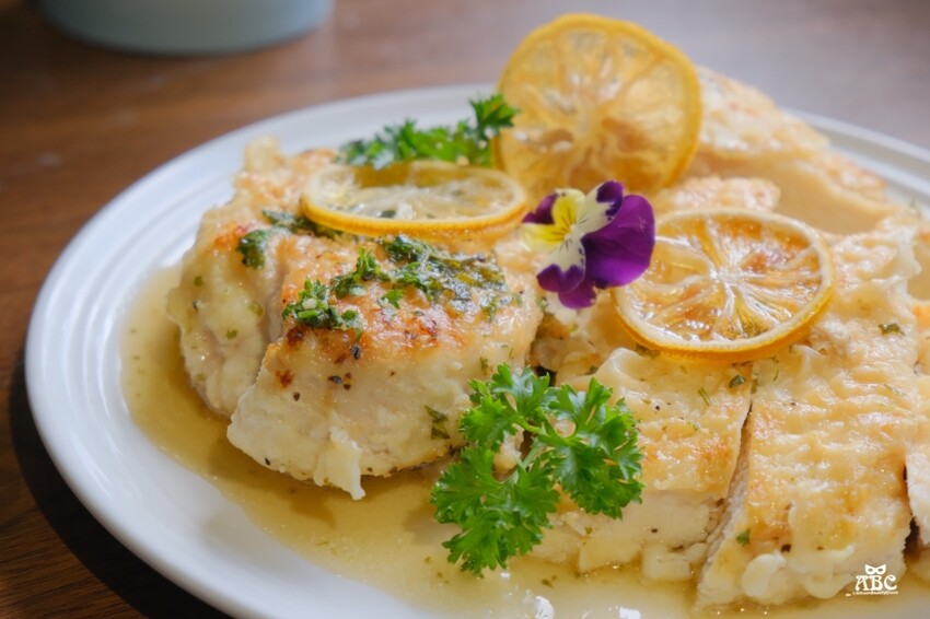 4. 開蓋翻面,確認兩面金黃色後,淋上檸檬汁、高湯,撒上香料及調味料提味,巴西里、香蒜粉、黑胡椒。小火煮4分鐘左右,等湯汁收差不多就可以起鍋擺盤完成!