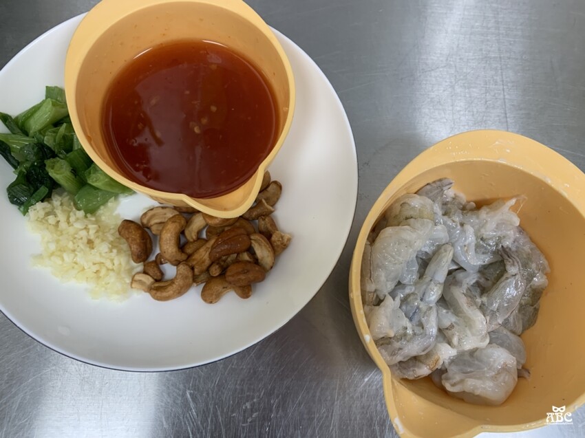 食材:蝦仁、腰果、番茄醬、白醋、白糖、蒜末、蔥段、白芝麻
