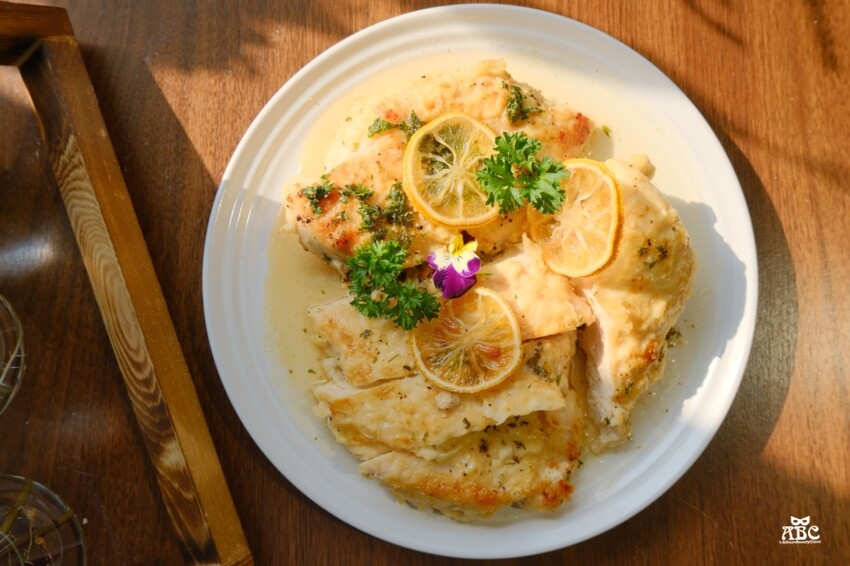 剛好冰箱有之前做的蜜漬檸檬片,順便拿來擺盤,清爽又鮮嫩多汁的香檸嫩煎雞排就完成了!簡單又營養!
