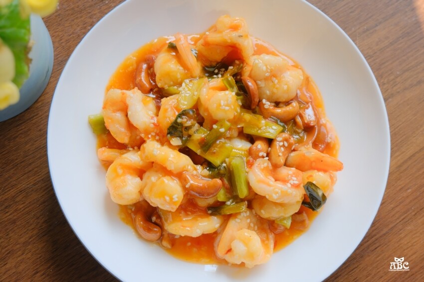 4. 倒掉多餘的油,鍋內只需一點點油,蒜末、蔥段下去炒香,接著腰果下去翻炒,再倒入糖醋醬汁,下蝦仁,一邊翻炒醬汁裹上蝦仁,醬汁變濃稠就可以起鍋了。起鍋前可以撒上白芝麻點綴。