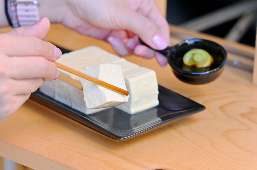鹽滷木棉豆腐屬於類似傳統板豆腐,口感紮實,入口的純粹濃厚豆香非常棒。單吃我就蠻喜歡的,有種淡淡的鹹味,口感很Q綿,店家推薦涼拌吃法也可以沾點醬油+芥末更好吃。「絹豆腐」則像是嫩豆腐那樣,入口溜滑嫩口感完全不同於上一道木棉豆腐。