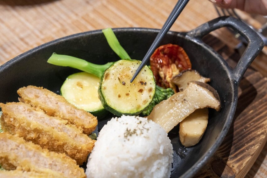 咖哩植物肉漢堡排飯一旁還有的風味烤鮮蔬可以一起享用,漢堡排就是要淋上滿滿香濃咖哩醬汁,豐富多樣化的菜色很推薦給大家!