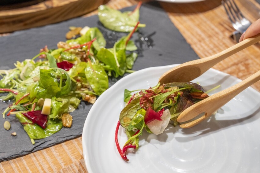 這次RÒU by T-HAM推出的蔬食套餐包含開胃小品、主廚特製沙拉、湯品(堅果南瓜濃湯+手工麵包)、主菜(松露野炒蕈菇+香料烤時蔬)、主食(咖哩植物肉漢堡排飯) $1680,開胃菜的部分有精選開胃小品和主廚特製沙拉,整體吃起來相當清爽!
