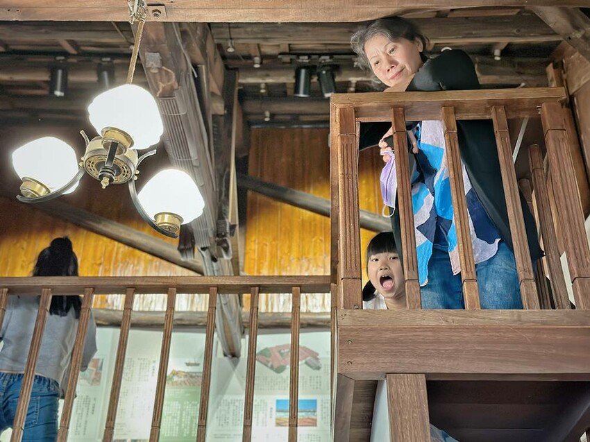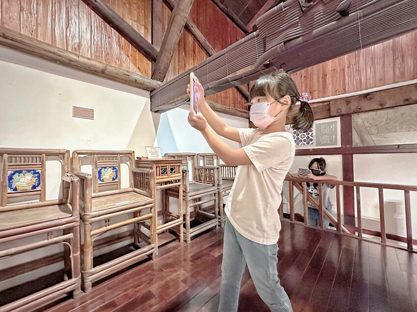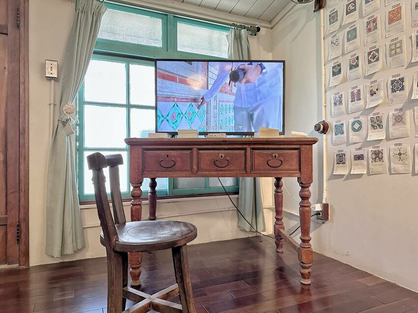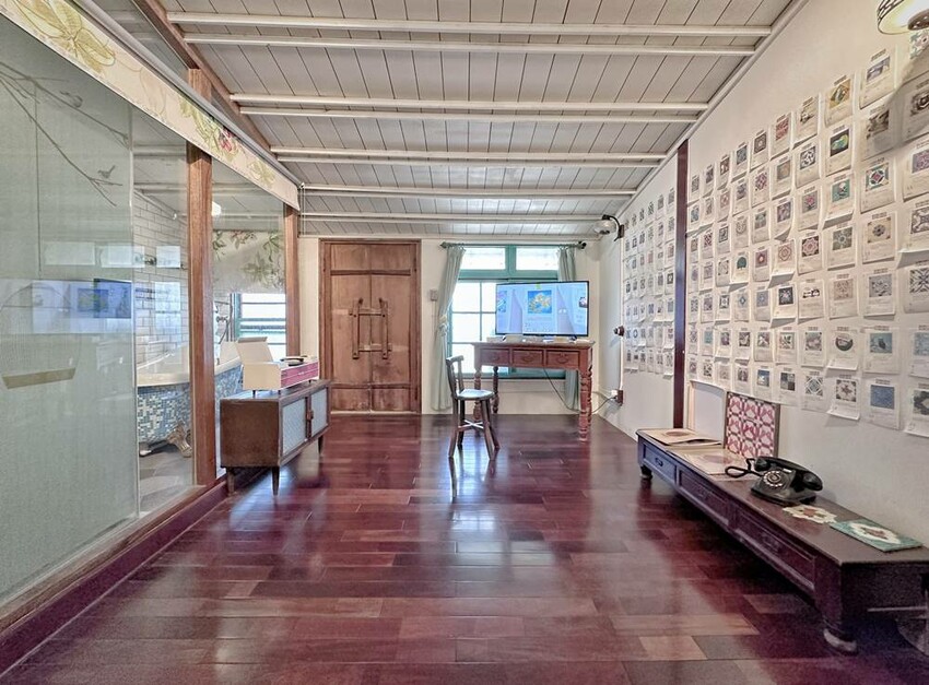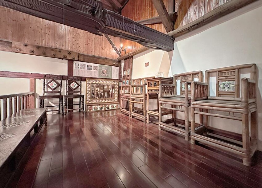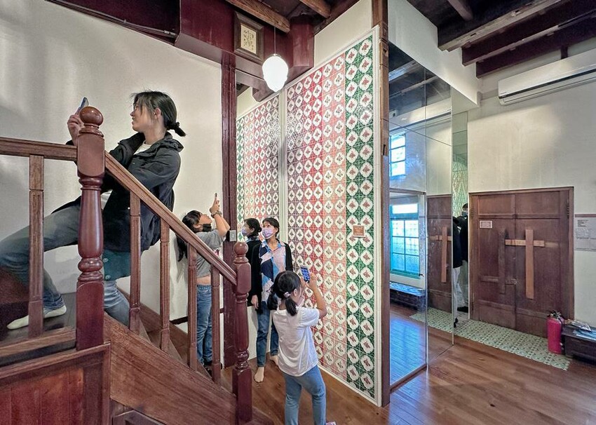準備走上二樓的樓梯又是一大美景,在這拍照打卡真的很不錯!二樓主要有影片播放區、少見的紅眠床、古物蒐藏、花磚家具等,閣樓上也有不少搶救花磚的故事、修復工程的文字記錄,而有蒐集各式搓章的朋友們,搓章本一定要帶上,這裡可有著不少花磚印章可以蒐集(蔬果姐妹看到就後悔自己沒帶到)。