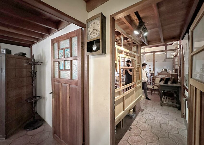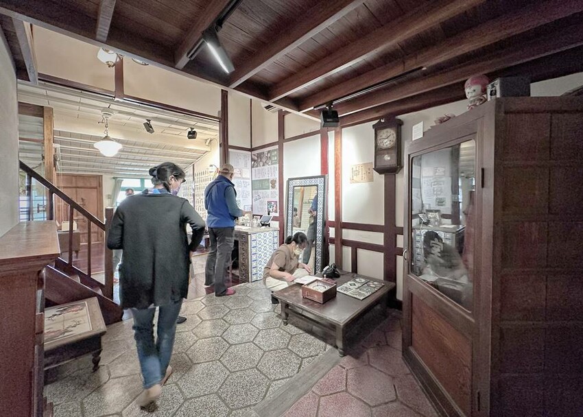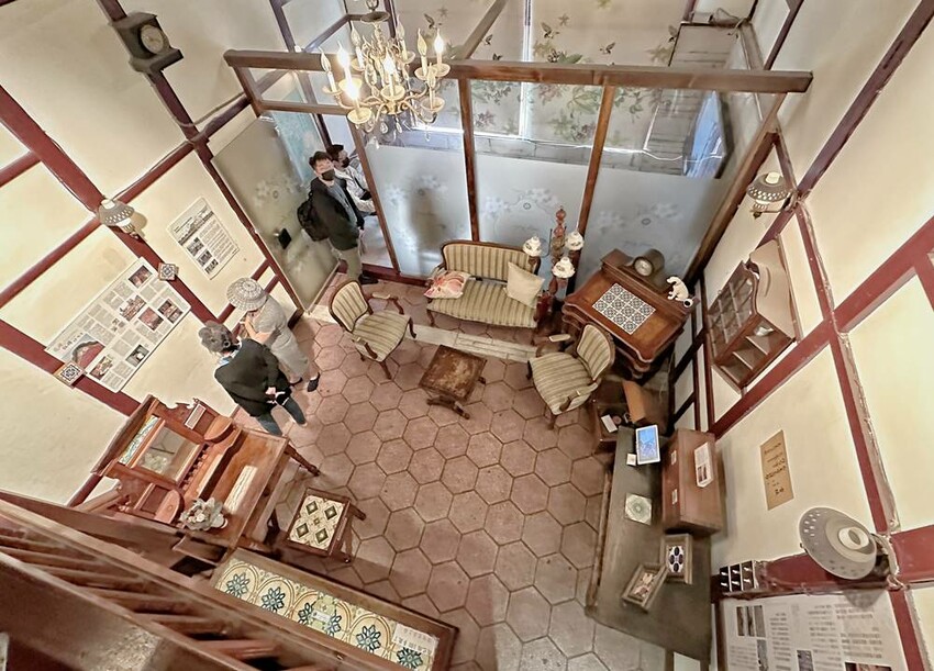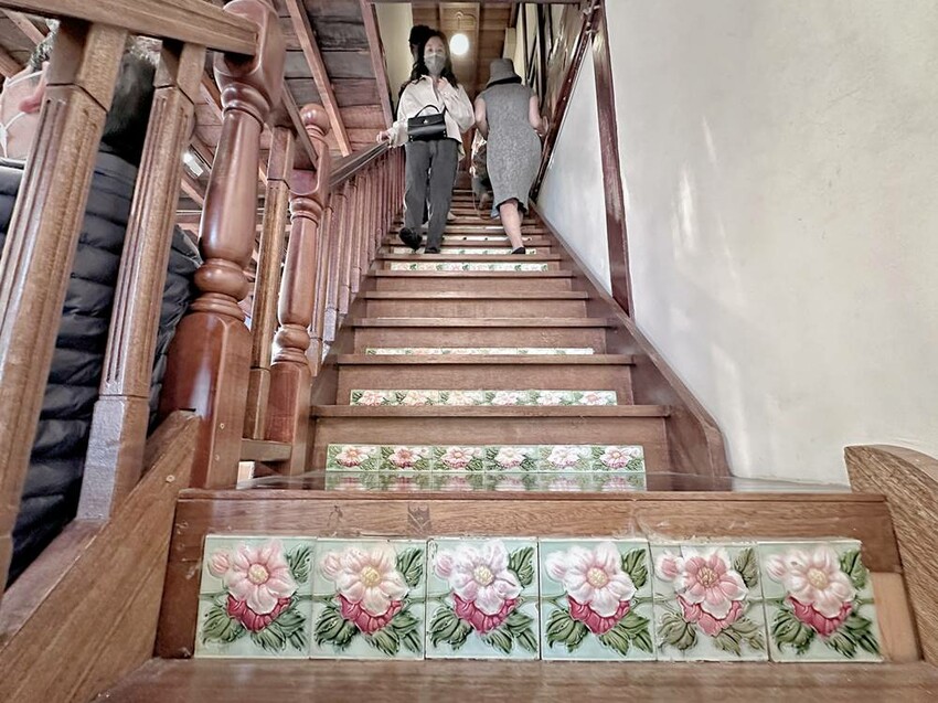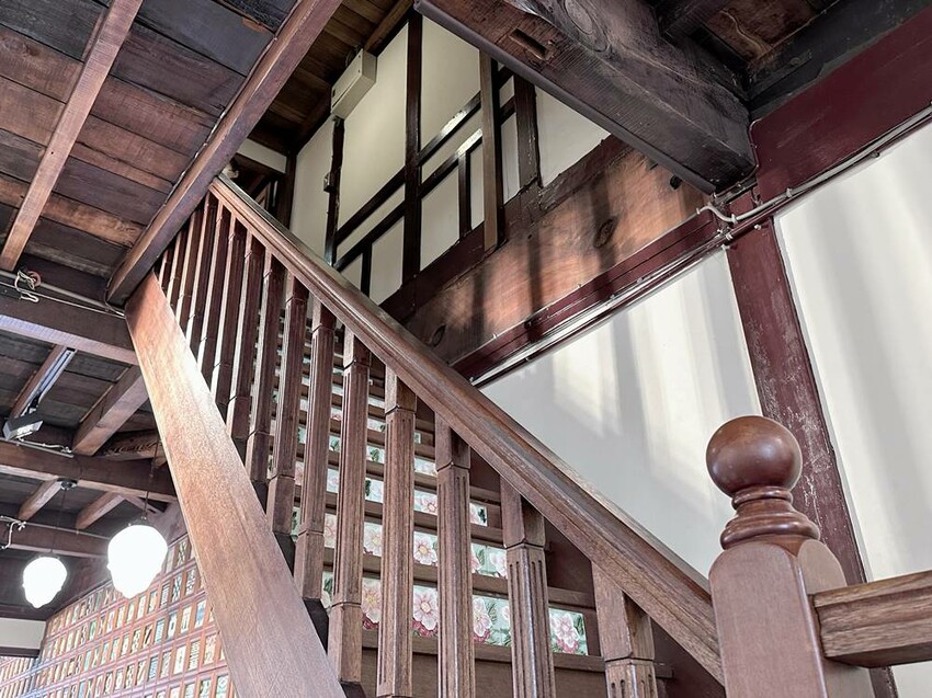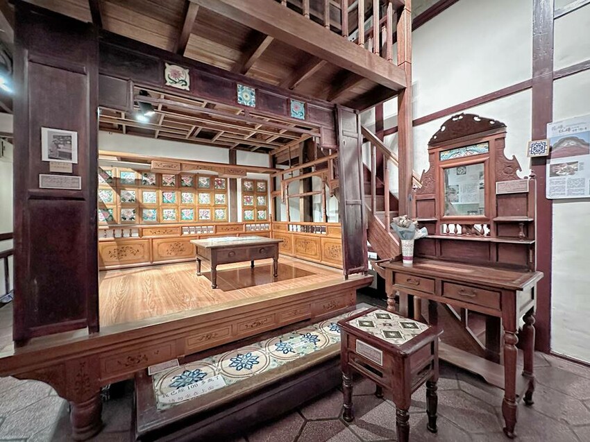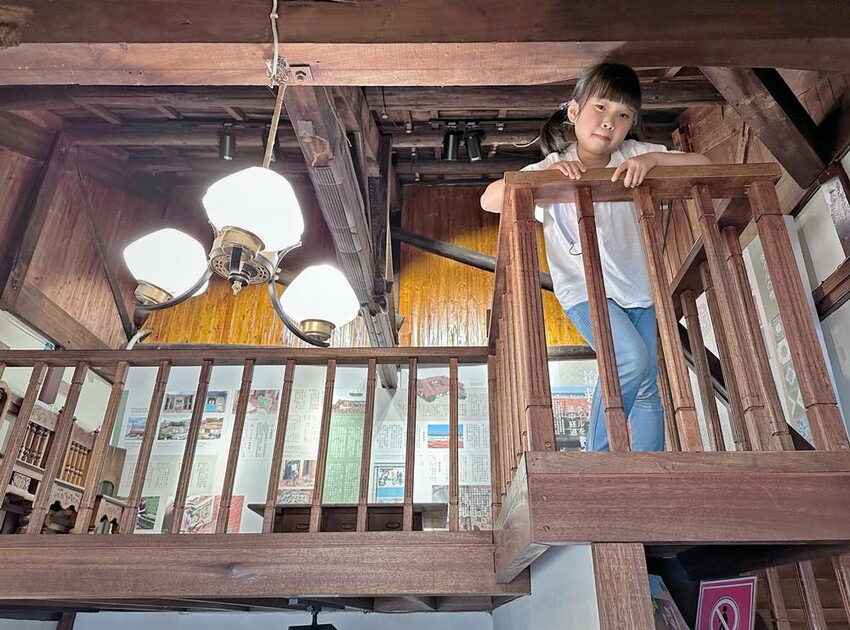 準備走上二樓的樓梯又是一大美景,在這拍照打卡真的很不錯!二樓主要有影片播放區、少見的紅眠床、古物蒐藏、花磚家具等,閣樓上也有不少搶救花磚的故事、修復工程的文字記錄,而有蒐集各式搓章的朋友們,搓章本一定要帶上,這裡可有著不少花磚印章可以蒐集(蔬果姐妹看到就後悔自己沒帶到)。
