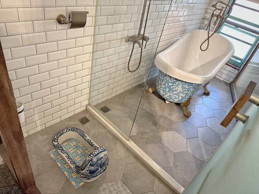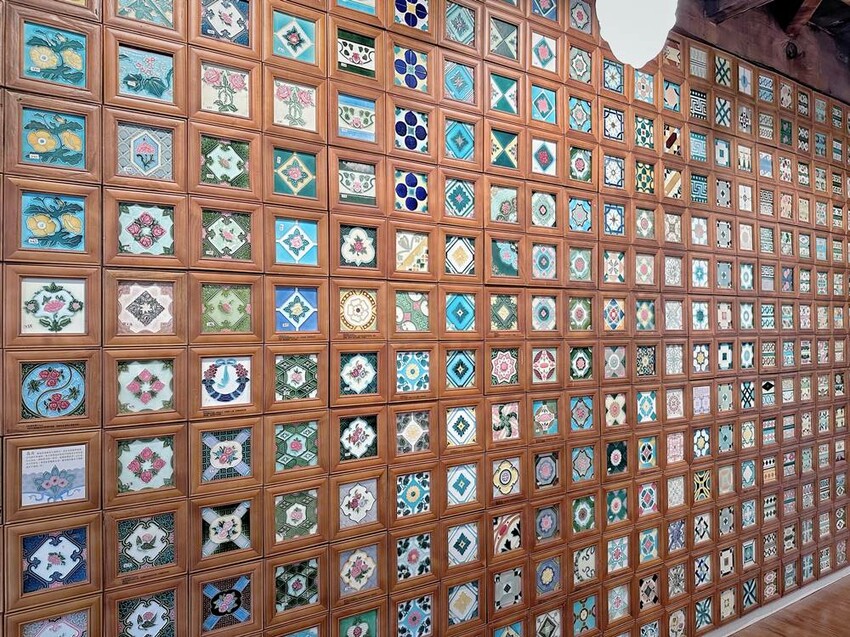 台灣花磚博物館一樓的兩面都是滿滿的花磚所舖設而成的花磚牆,中間區域則為商品販售區,一樓的後方則有牡丹花鏡牆以及青花瓷小便斗等,可讓旅人們可以拍照打卡,採買紀念品等。