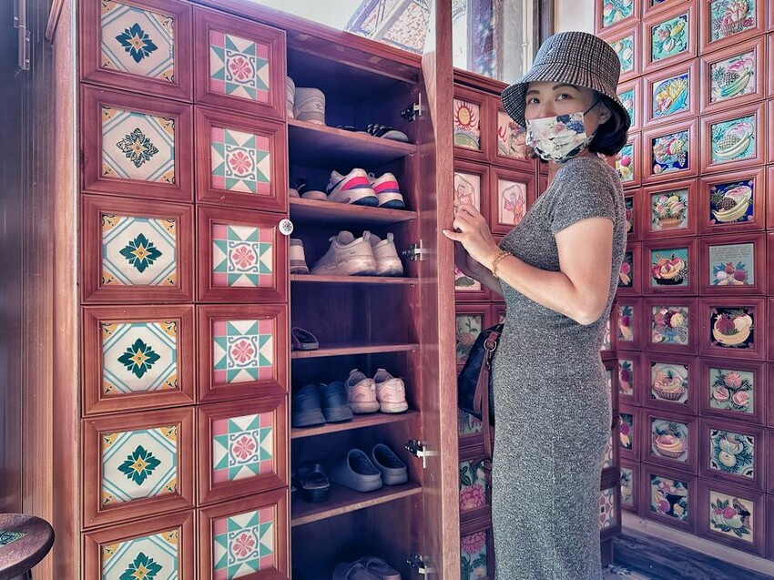因台灣花磚博物館的前身是阿里山林業最大的木材行-德豐材木商行,裡面的木地板就是千年檜木所鋪設,所以走進台灣花磚博物館是需要脫鞋才能入內,也讓來訪的朋友們可以更加親密的去感受用腳踩踏檜木的體驗,也要說這大大的鞋櫃也弄得好美,我好喜歡!