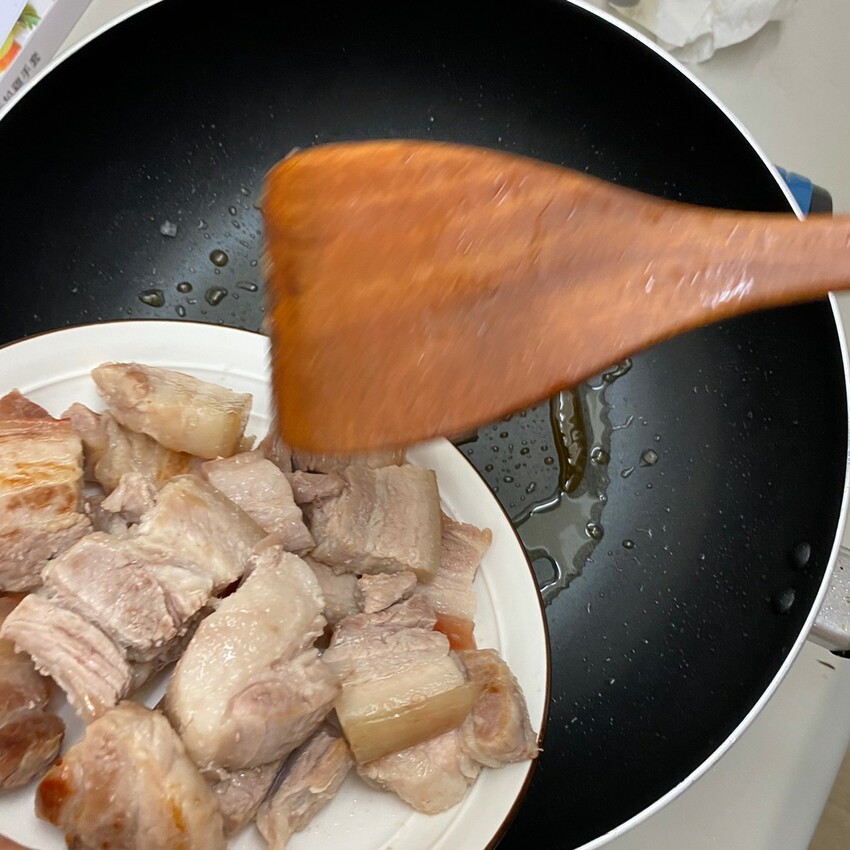 所以把剛洗淨的豬肉瀝乾後,與大蒜一起放入炒鍋