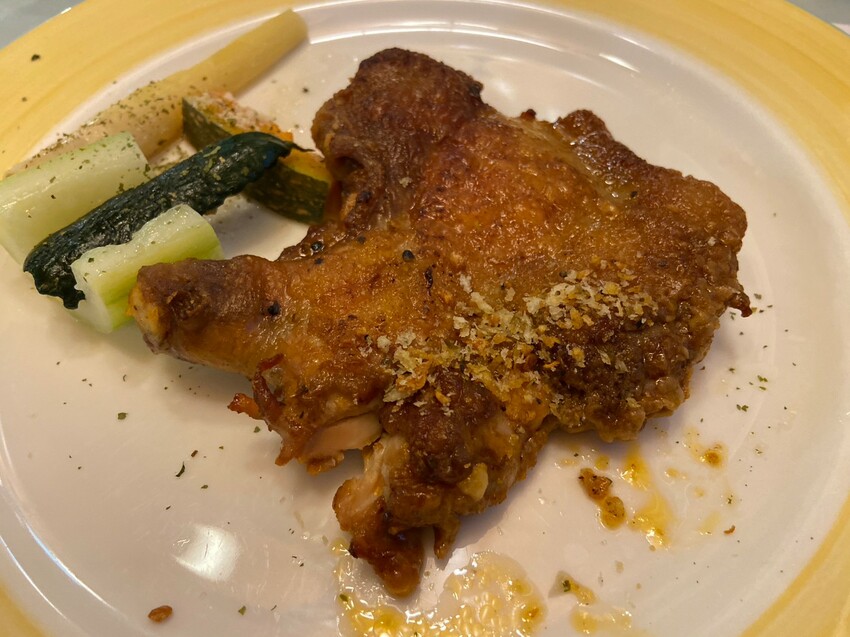 雞腿外皮雖然沒有到很酥脆,但可能一次出餐給我們這群人,分批出餐及天氣冷食物冷掉的影響。