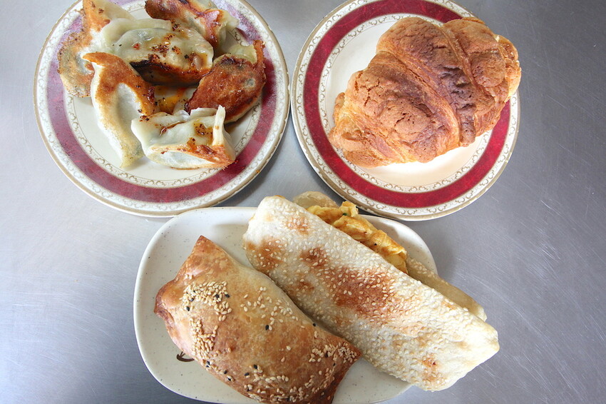 櫥櫃裡放置多種燒餅和其他餐點供選擇,想要什麼餐點就直接畫菜單給服務員。