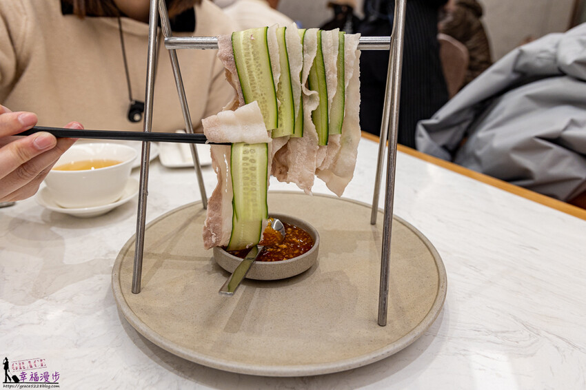 鞦韆晾肉架價格408元,小黃瓜切成薄片搭配三層肉薄片沾上醬汁一起入口,小黃瓜清甜帶出豬肉的香氣,重點是這肉片一點都不會油膩,搭上醬汁風味更佳。