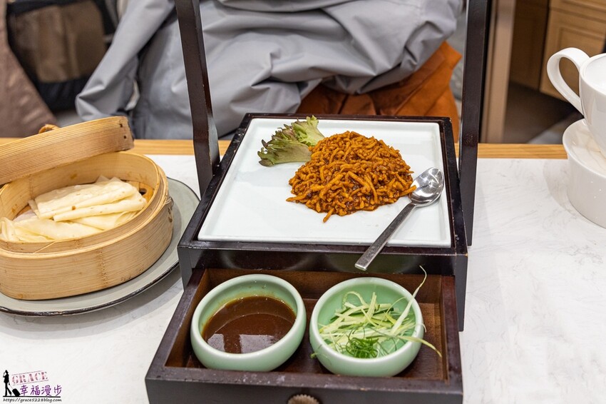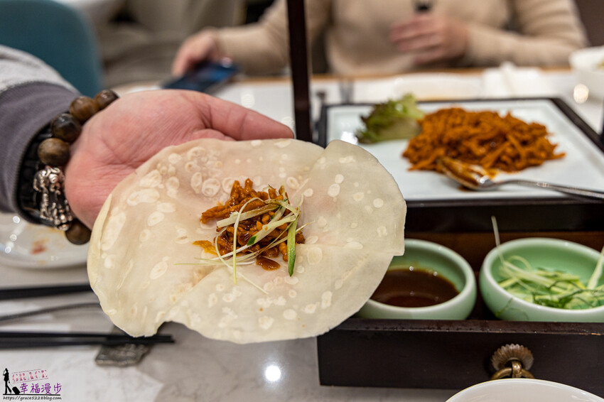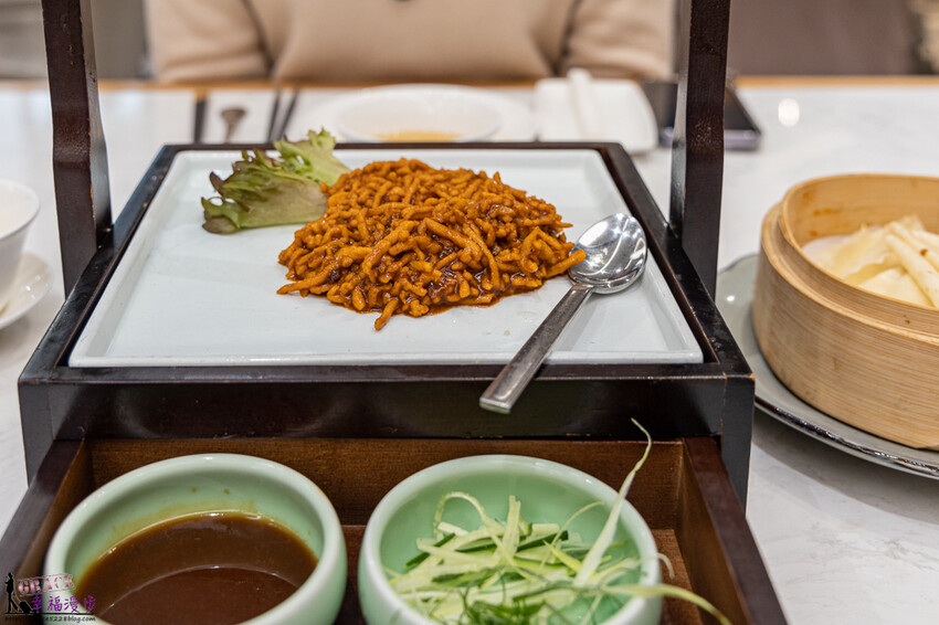 京醬爆豬絲佐鴨餅價格458元,切到細緻的豬肉絲跟主廚特調醬汁一起爆炒,肉絲軟嫩醬香氣十足又不會太鹹膩,單吃就很下飯了喔!