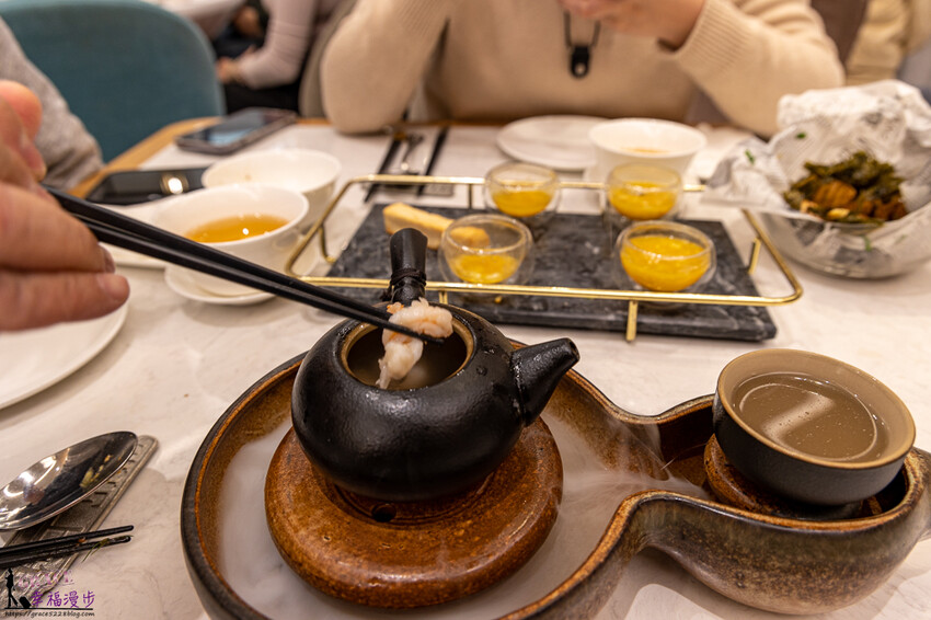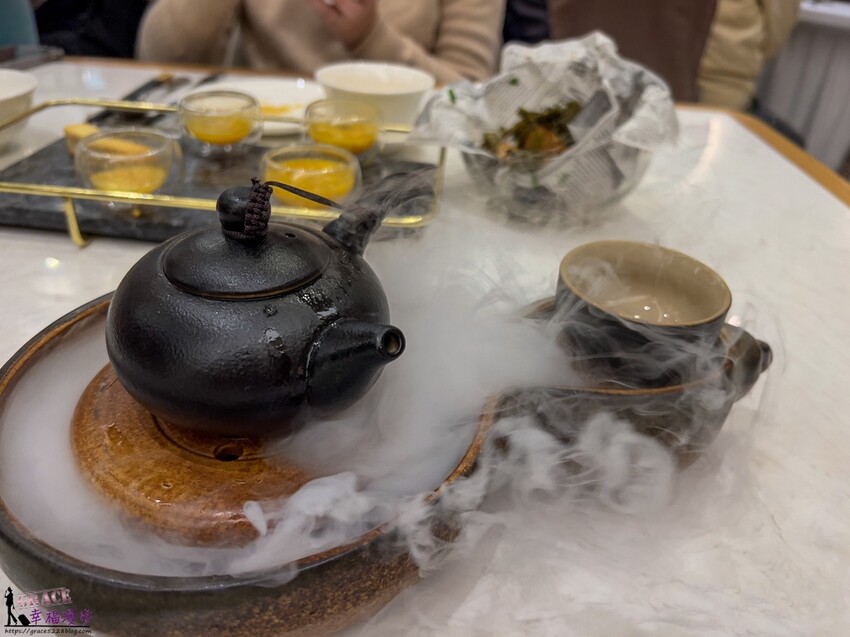 煙波金丹湯價格328元,這道湯品相當浮誇,用著葫蘆造型的托盤,上面有著乾冰,用著茶壺裝盛湯品,整個煙霧繚繞也太好拍了。