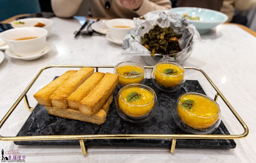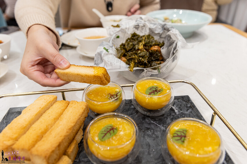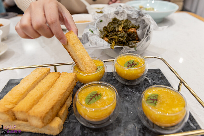 蟹黃閣吐司價格448元,又是一道擺盤精美的料理,跳脫傳統的蟹黃吃法,將烤到酥香的吐司沾上蟹黃湯汁,吸飽醬汁的吐司滿滿的鮮味,吃起來又點飽足感,這道料理我喜歡。