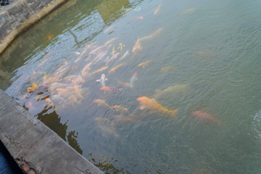 有一大池水裡面養了非常多的錦鯉,小孩最愛的就是把飼料灑下