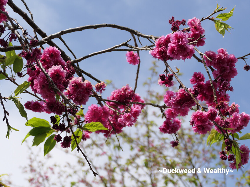 為山櫻花的改良品種,花色為鮮豔的桃紅色,花瓣多層繁密,